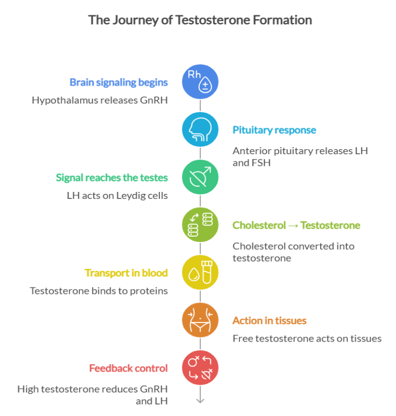 Testosterone production follows a tightly regulated, stepwise process controlled by the brain and testes. Let’s understand it in a simpler way.
