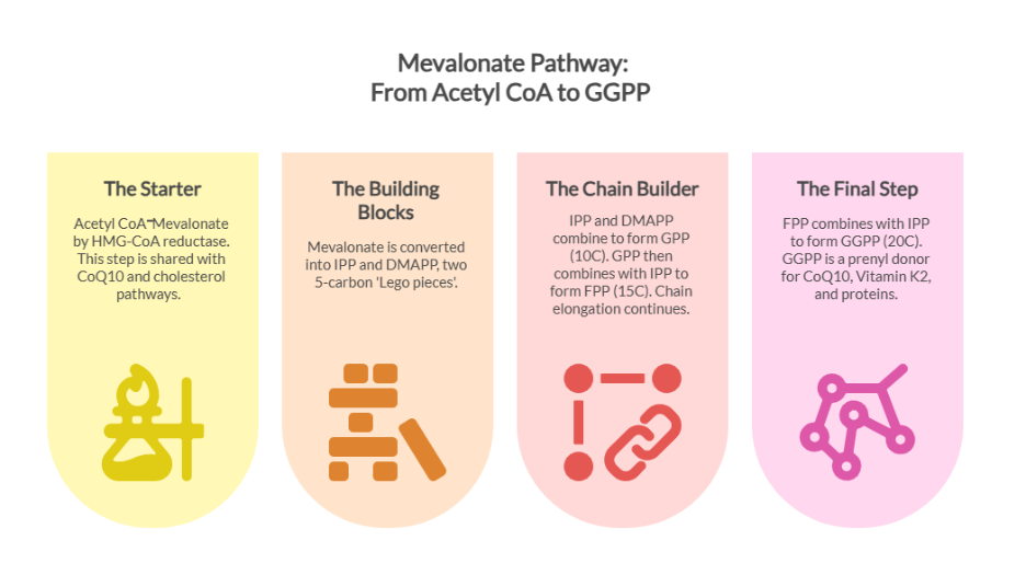 - It acts as a key precursor for essential biomolecules, including CoQ10, vitamin K2 (MK-4), and geranylgeranyl pyrophosphate (GGPP).