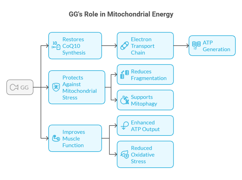 Geranylgeraniol (GG) is an essential byproduct of the mevalonate pathway, the same pathway responsible for producing key molecules needed for cell survival, mitochondrial function, energy production (ATP), and inflammation regulation.