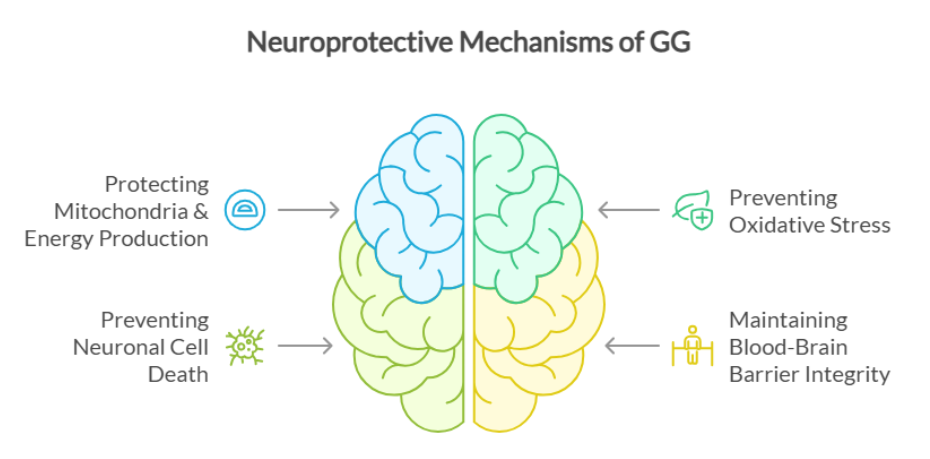 - GG supports mitochondrial energy production, reduces inflammatory cytokines, prevents neuronal cell death, and helps maintain BBB integrity.