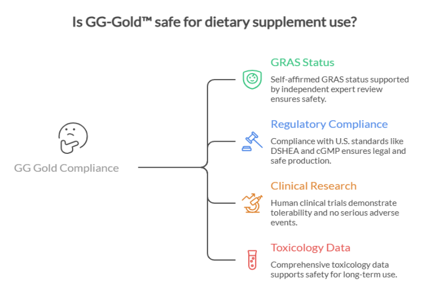 - GRAS-affirmed safety and GMP-aligned manufacturing position GG-Gold™ for compliant use in North American dietary supplements.